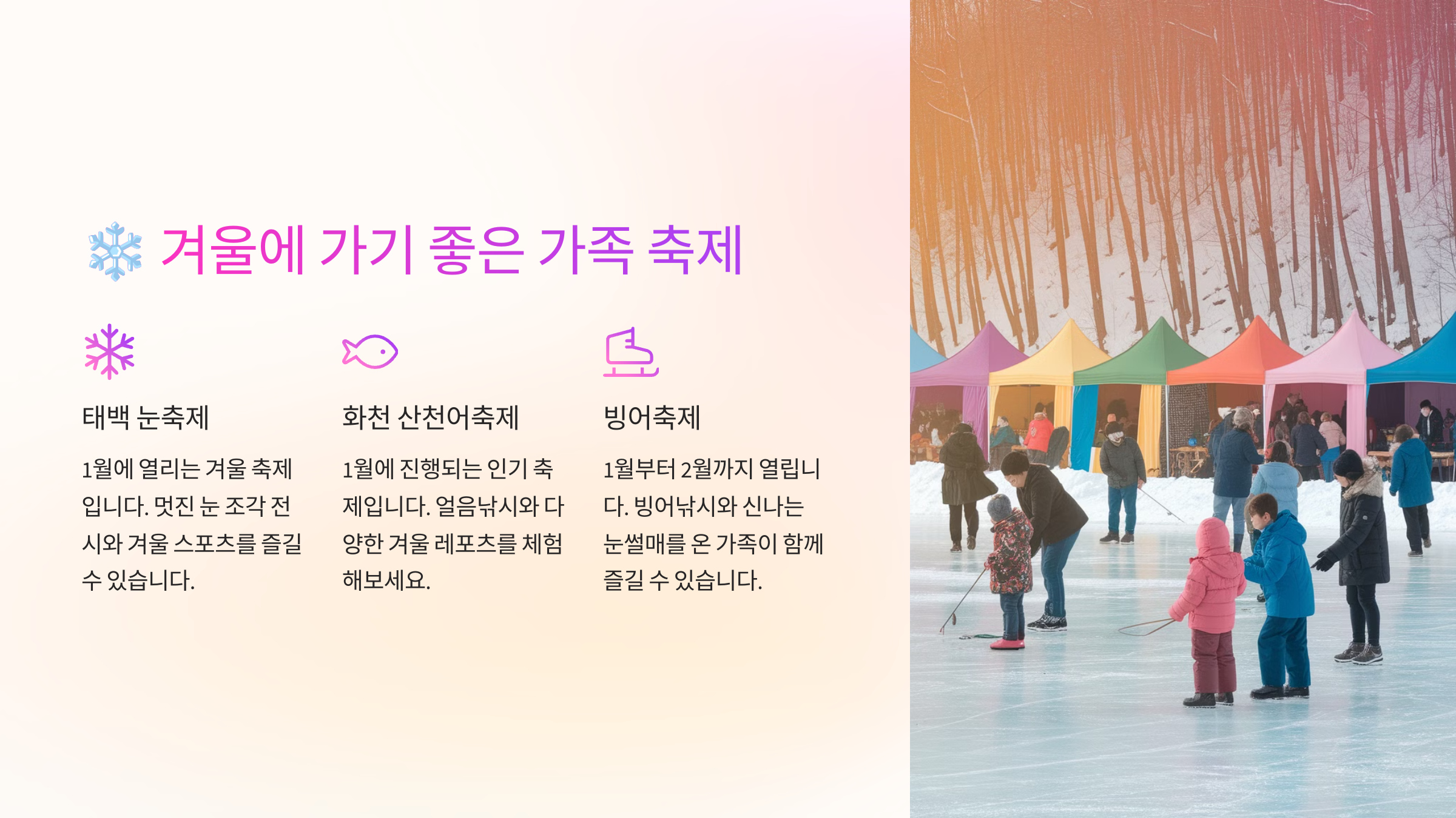 겨울은 하얀 눈과 함께하는 낭만적인 축제들이 가득한 계절이에요. 특히 반짝이는 조명 축제, 얼음낚시, 눈썰매 같은 체험들이 많아서 가족과 함께하기 딱 좋아요! ⛄