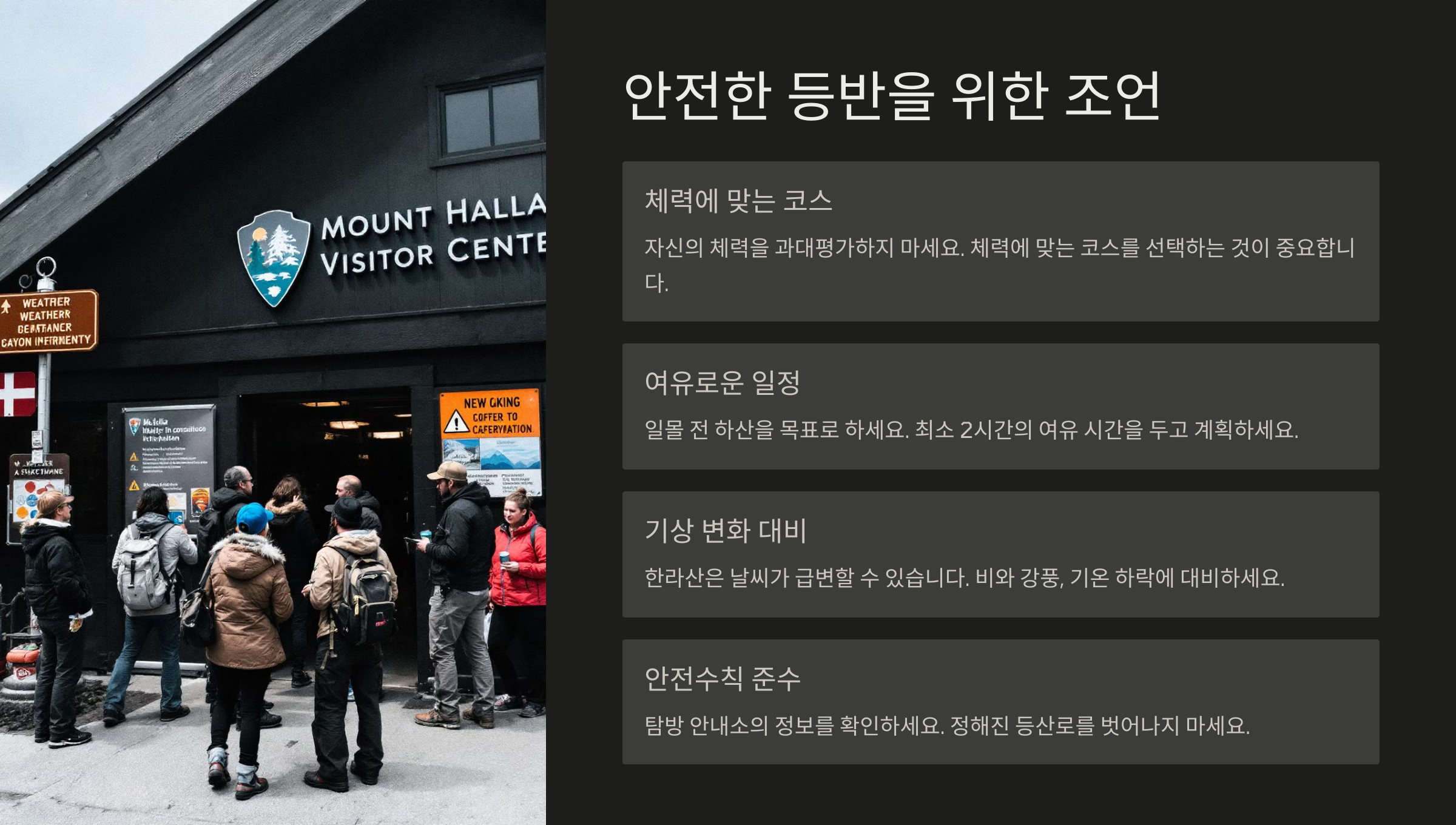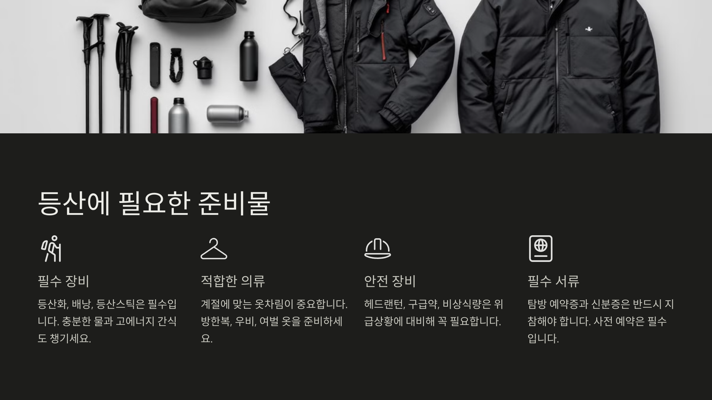 | 등산 장비 확인 | 아이젠, 등산화 등 필수 장비를 반드시 점검하세요. |