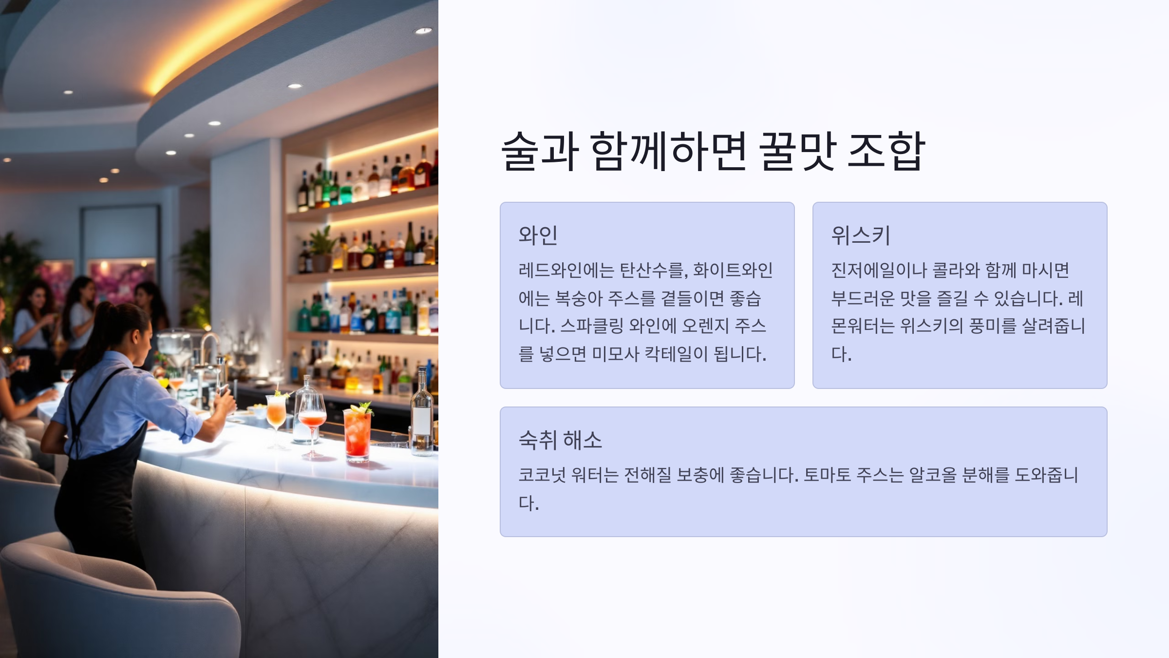 👇 아래에서 과일 주스, 술과 함께하면 좋은 음료 조합을 확인하세요!