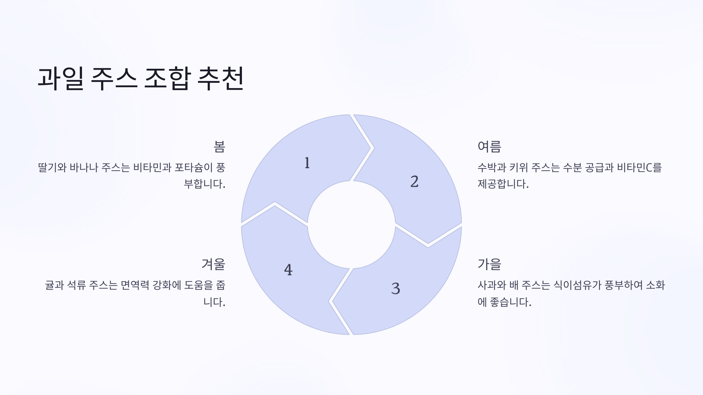 과일 주스는 단독으로 마셔도 맛있지만, 이렇게 조합하면 새로운 맛을 경험할 수 있어요! 🍍🍹