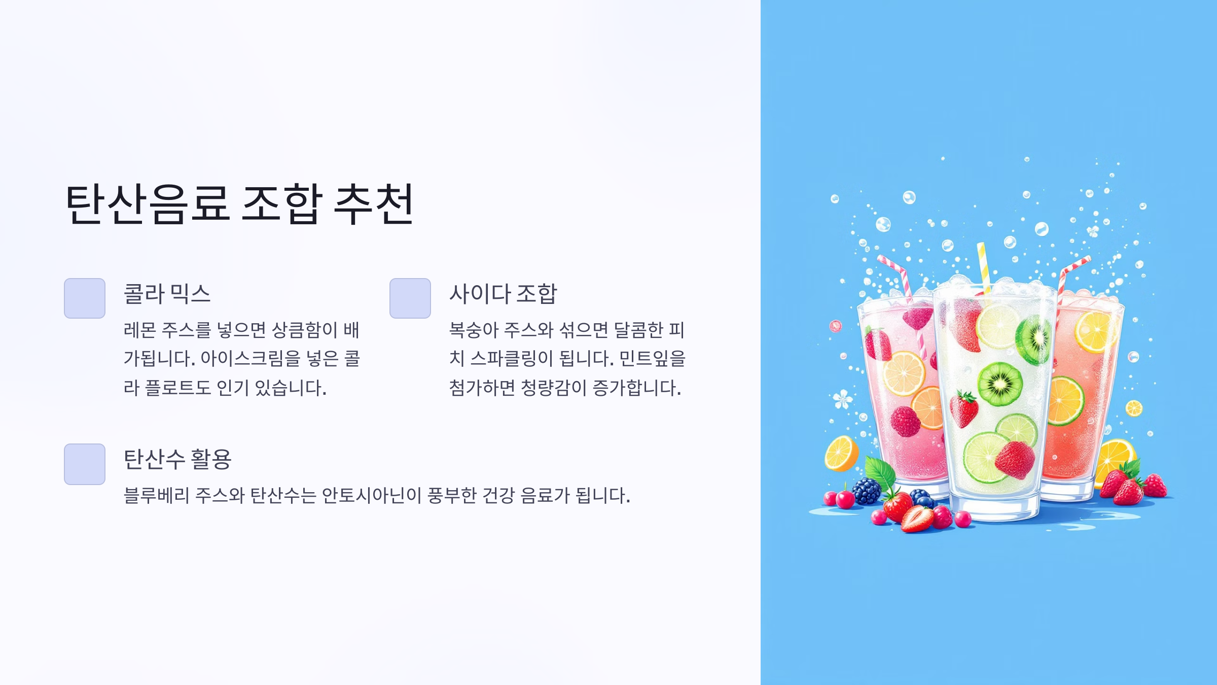 탄산음료는 다양한 맛과 조합이 가능해서 실험해보는 재미가 쏠쏠해요! 😉