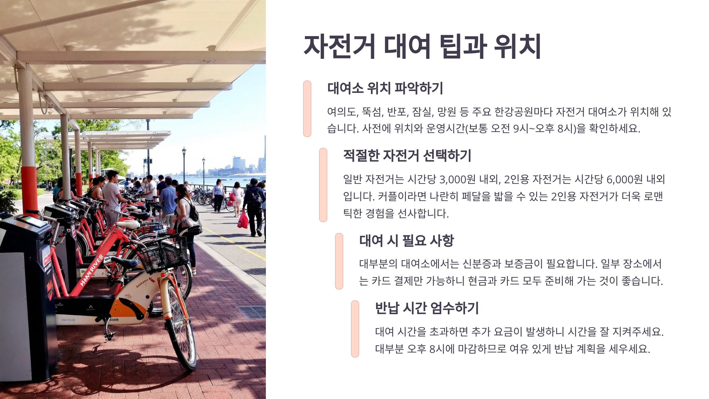 민간 자전거 대여소는 반포, 여의도, 뚝섬 등에 집중되어 있습니다.